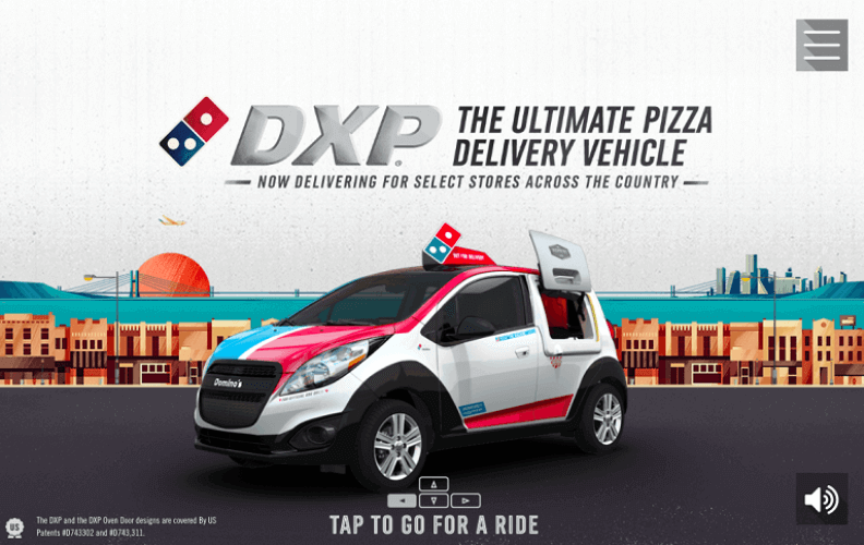示例: Domino Pizza 创建了一个微型网站,目的是展示他们的特殊送货车。在这个微型站点中,客户可以执行许多操作,例如放大和缩小以查看车辆的全部细节。作为公司的一项新服务,这为客户带来了兴奋。
